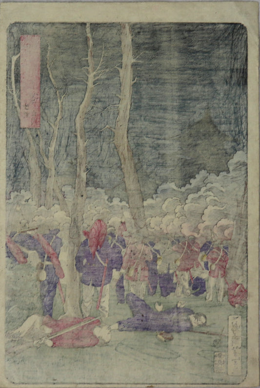 Shirakawa in Rikuzen from the series " 8 Views of warriors in the Provinces" by Yoshitoshi / Shirakawa dans la Province de Rikuzen de la série " 8 vues de guerriers dans les Provinces" par Yoshitoshi (1871)