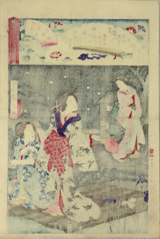 Sakyo of Hikota-ro watching fireflies from the series " Praise for multi-colored blossoms "by Chikanobu / Sakyo de la Hikota-ro et ses compagnes regardant les lucioles de la série " Eloge pour les fleurs muticolores " par Chikanobu (1883)