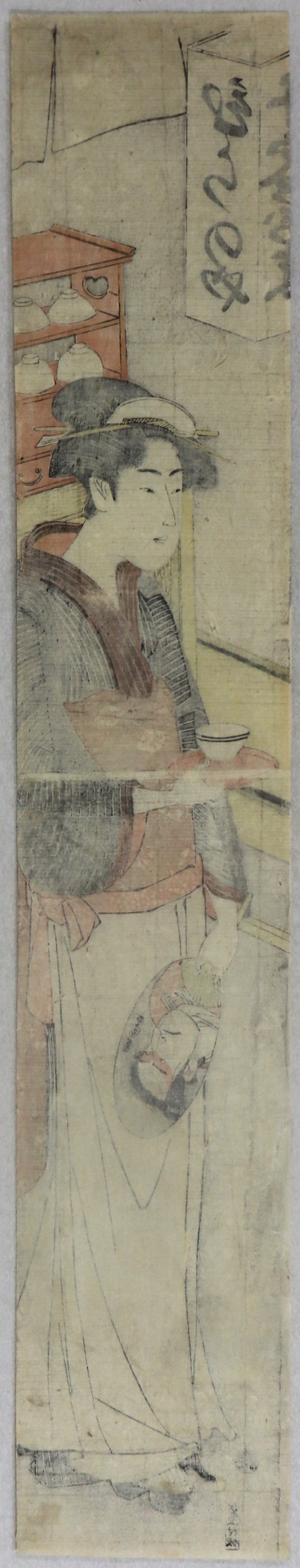 Hirano-ya waitress with Ichikawa Danjuro's fan by Toyokuni I / Une serveuse de la maison de thé Hirano-ya portant un éventail avec le profil d'Ichikawa Danjuro par Toyokuni I (1800's)