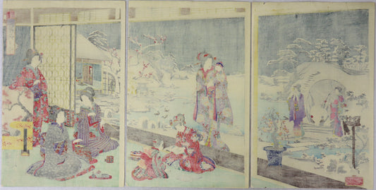 Enjoying in Snow garden from the series "Snow, Moon,Flowers" by Nobukazu / Amusement dans le jardin enneigé de la série " Neige, Lune, Fleurs " par Nobukazu ( 1890)