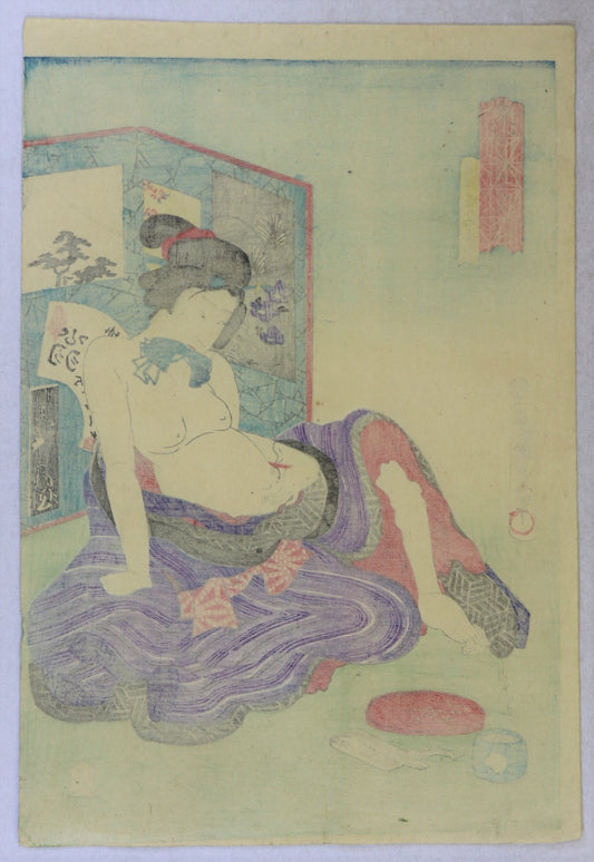 Pregnant Woman applying Moxibustion from the series " A Collection of Tokyo Beauties by Kunisada II / Femme Enceinte pratiquant la Moxibustion par Kunisada II (1868)
