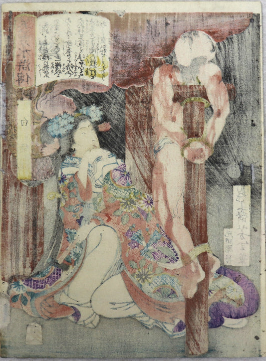 Shiranui kneeling beside a crucified man from the series " Handsome and Brave Heroes of the Suikoden" by Yoshitoshi / Shiranui agenouillée devant un homme crucifié de la série " Beaux et Courageux héros du Suikoden "par Yoshitoshi ( 1866)