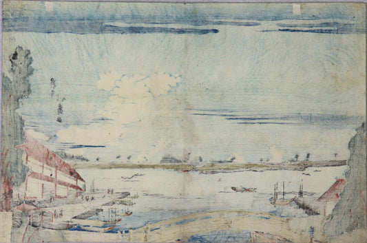 View of Ushijima across the Asakusa River from the Mouth of San'ya moat by Hokuju /Vue d'Ushijima de l'autre côté de la rivière Asakusa depuis l'embouchure des douves de San'ya de la série " La Capitale de l'Est" par Hokuju (1810-1824)