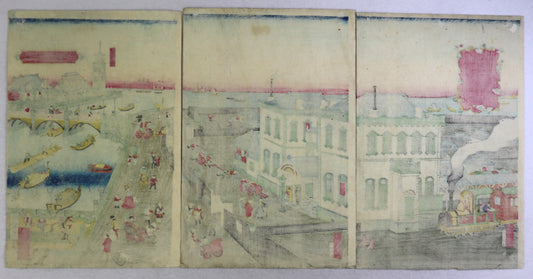 Steam Train at Shinbashi station from the series " Famous Places of Tokyo "by Hiroshige III / Train à Vapeur à la gare de Shinbashi de la série " Célèbres Lieux de Tokyo" par Hiroshige III ( 1870's)