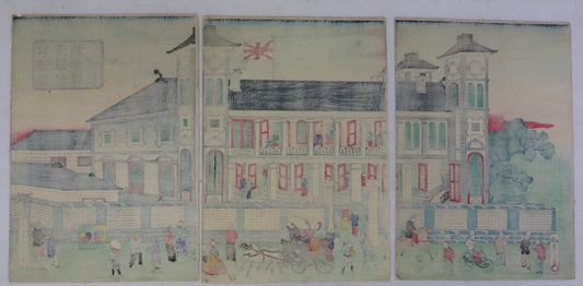 The Incomparable and Marvelous English Office Buiding at Yokohama par Kunisada III / Le Merveilleux et Incomparable Consulat Anglais à Yokohama par Kunisada III (1870)