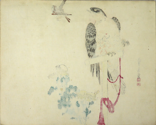 Falcon on perch, sparrow and Narcissus by Sadanobu II / Faucon sur un poteau , moineau et Narcisse par Sadanobu II