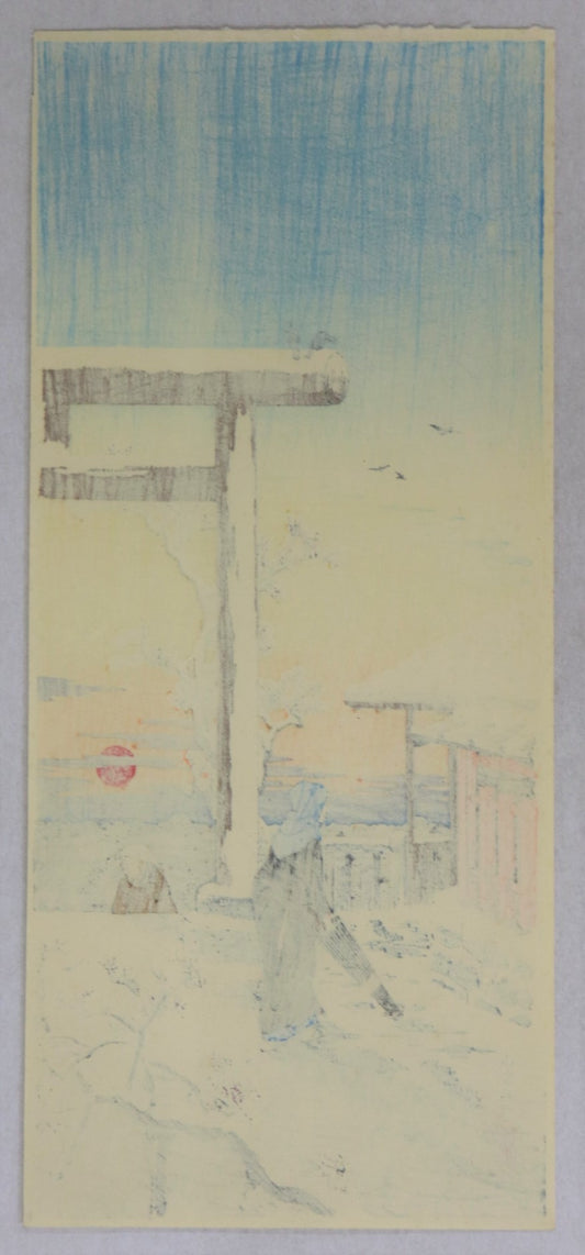 Sunset at Yushima Tenjin shrine in snow by Takahashi Hiroaki / Le coucher du soleil au sanctuaire Tenjin à Yushima sous la neige par Takahashi Hiroaki (1920's)