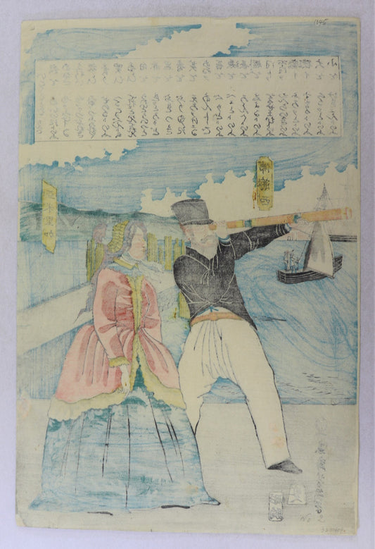 French man and American woman walking on the quays of the port by Yoshiiku / "Un Français et une Américaine se promenant sur les quais du port " par Yoshiiku (1861)
