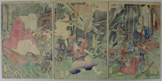 Ushiwakamaru learns the Martial Art from Sojobo, king of Tengu by Yoshitoshi / Ushiwakamaru apprend les arts martiaux grâce à Sojobo, roi des Tengu par Yoshitoshi (1865)