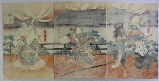 Benkei, Shizuka-gozen and Yoshitsune preparing to meet Tosa-bô Shôshun's atatck on the Horikawa Palace by Kuniyoshi / Benkei , Shizuka-gozen et Yoshitsune se préparant à l'attaque de Tosa-bô Shôshun sur le palais d'Horikawa par Kuniyoshi ( 1842-1843)