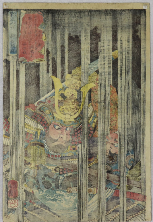 Night Rain at Narumi ( Inagawa Yoshioto)from the series " Eight Views of Military Brilliance " by Kuniyoshi /Nuit Pluvieuse à Narumi de la série "Huit Vues de l'éclat Militaire" par Kuniyoshi ( 1852)