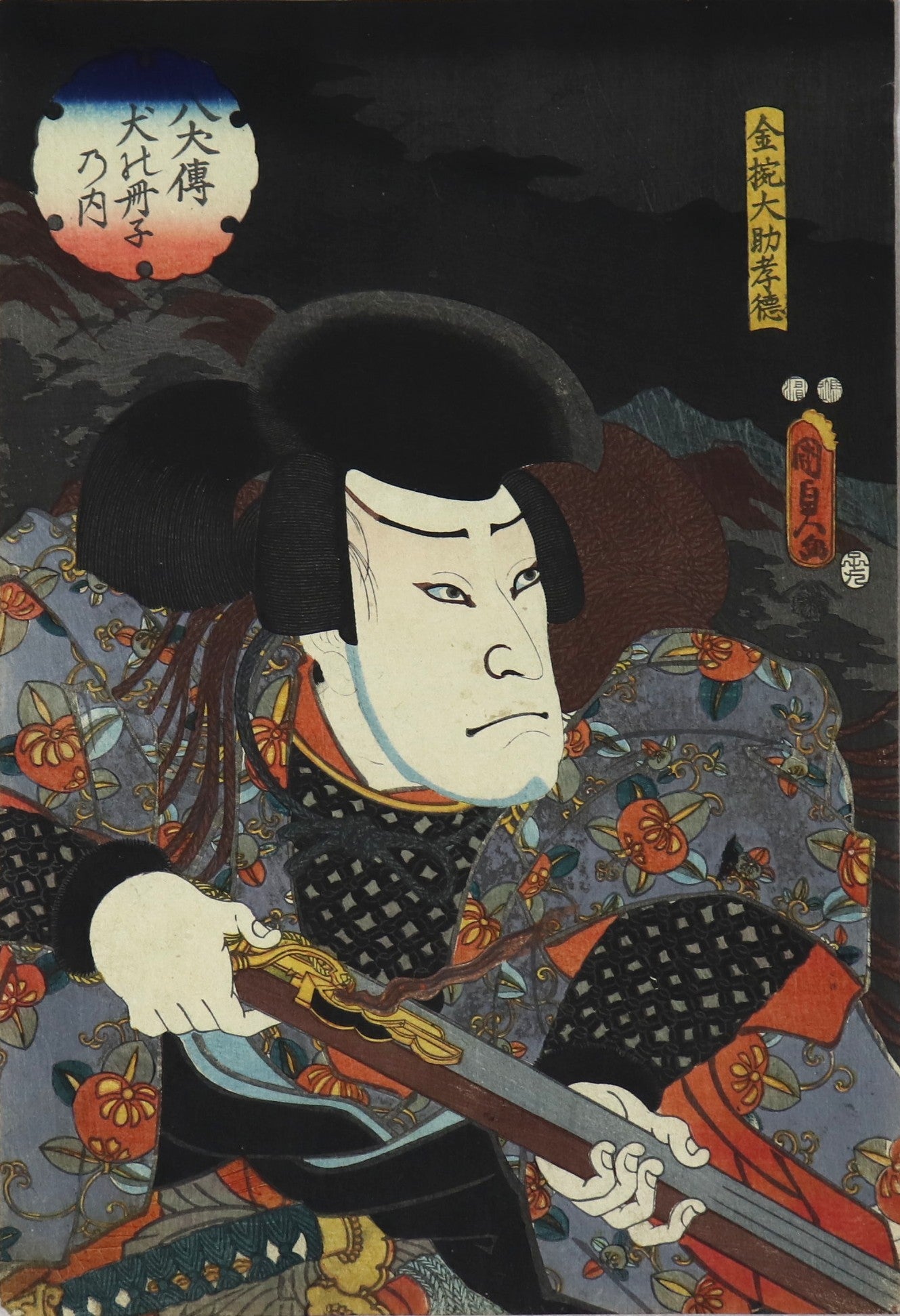 Arashi Rikaku II as Kanamari Daisuke Takanori from the series " Book of Eight Dog Heros " by Kunisada II / Arashi Rikaku II dans le rôle de Kanamari Daisuke Takanori de la série "Le livre des Huit Chiens Héros " par Kunisada II