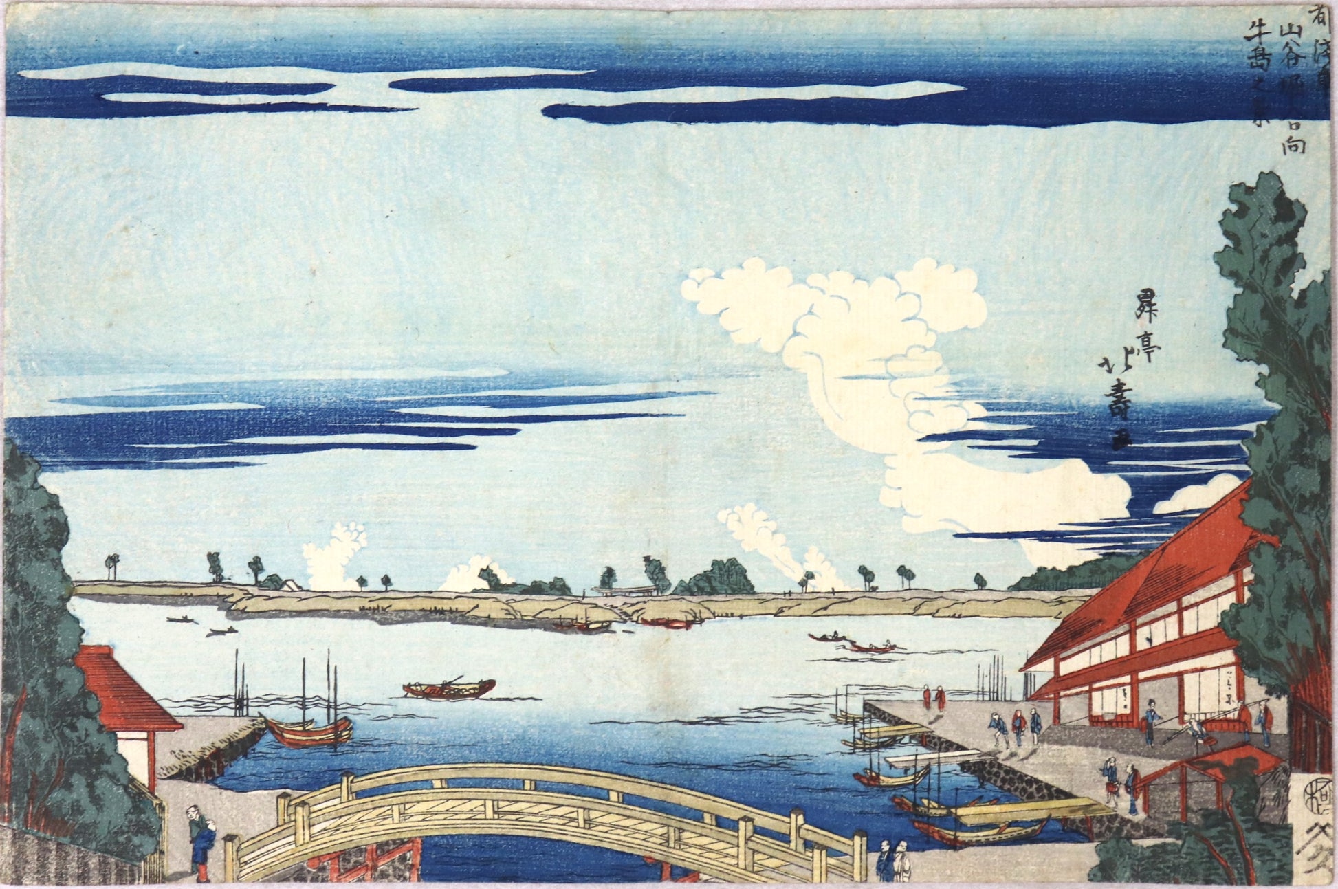 Titre de l’estampe (Print’s title) :View of Ushijima across the Asakusa River from the Mouth of San'ya moat/Vue d'Ushijima de l'autre côté de la rivière Asakusa depuis l'embouchure des douves de San'ya